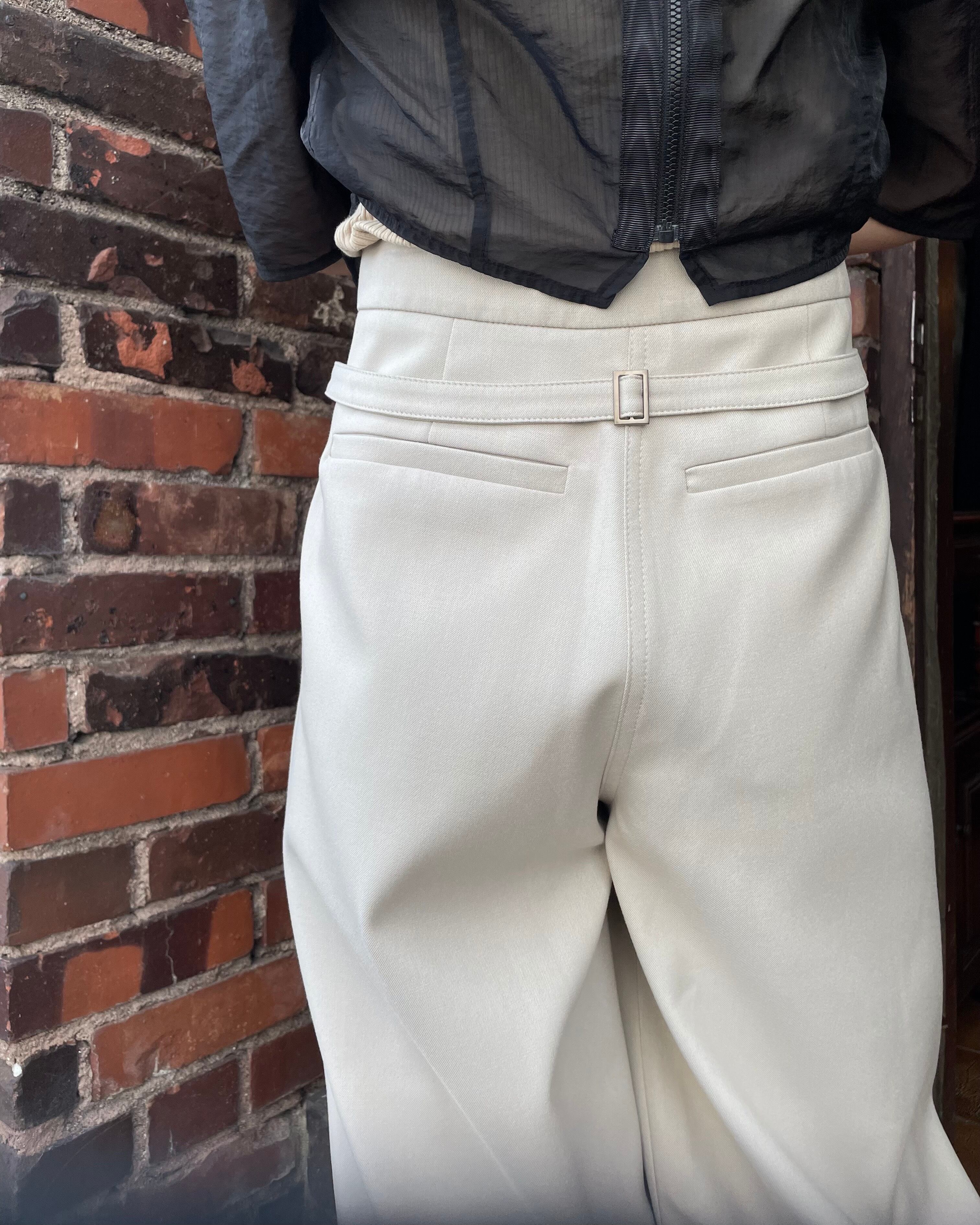 レーヨン混によりキメ細やかでつるっとした上品な生地面の表情を持つ生地を使用し、ストンと裾まで落ちるワイドなシルエットに、フロントのジップ付きの立体的なポケットやバックのアジャスタブルベルトなどのデザインでアクセントを加えたワイドスラックスになります。