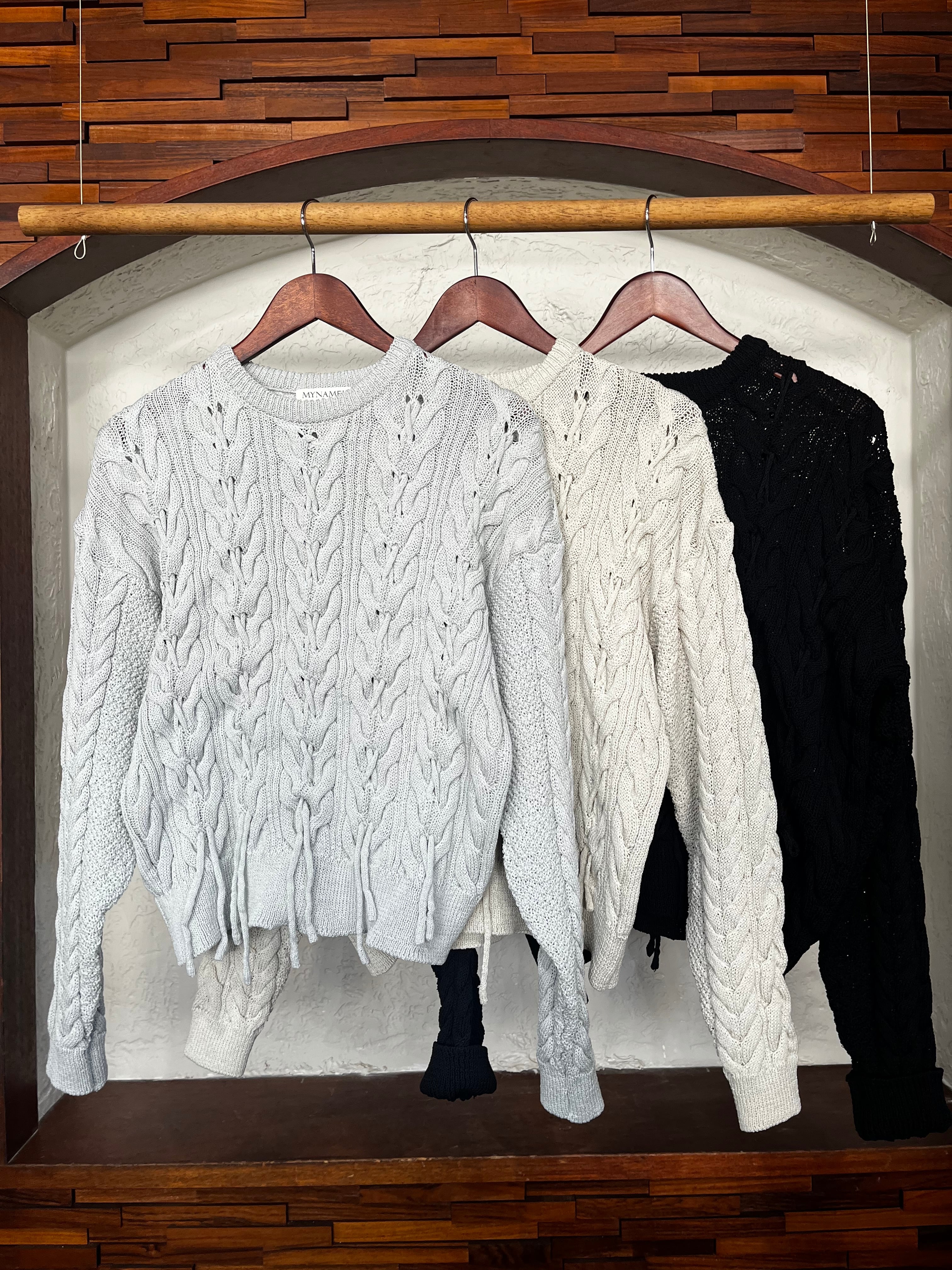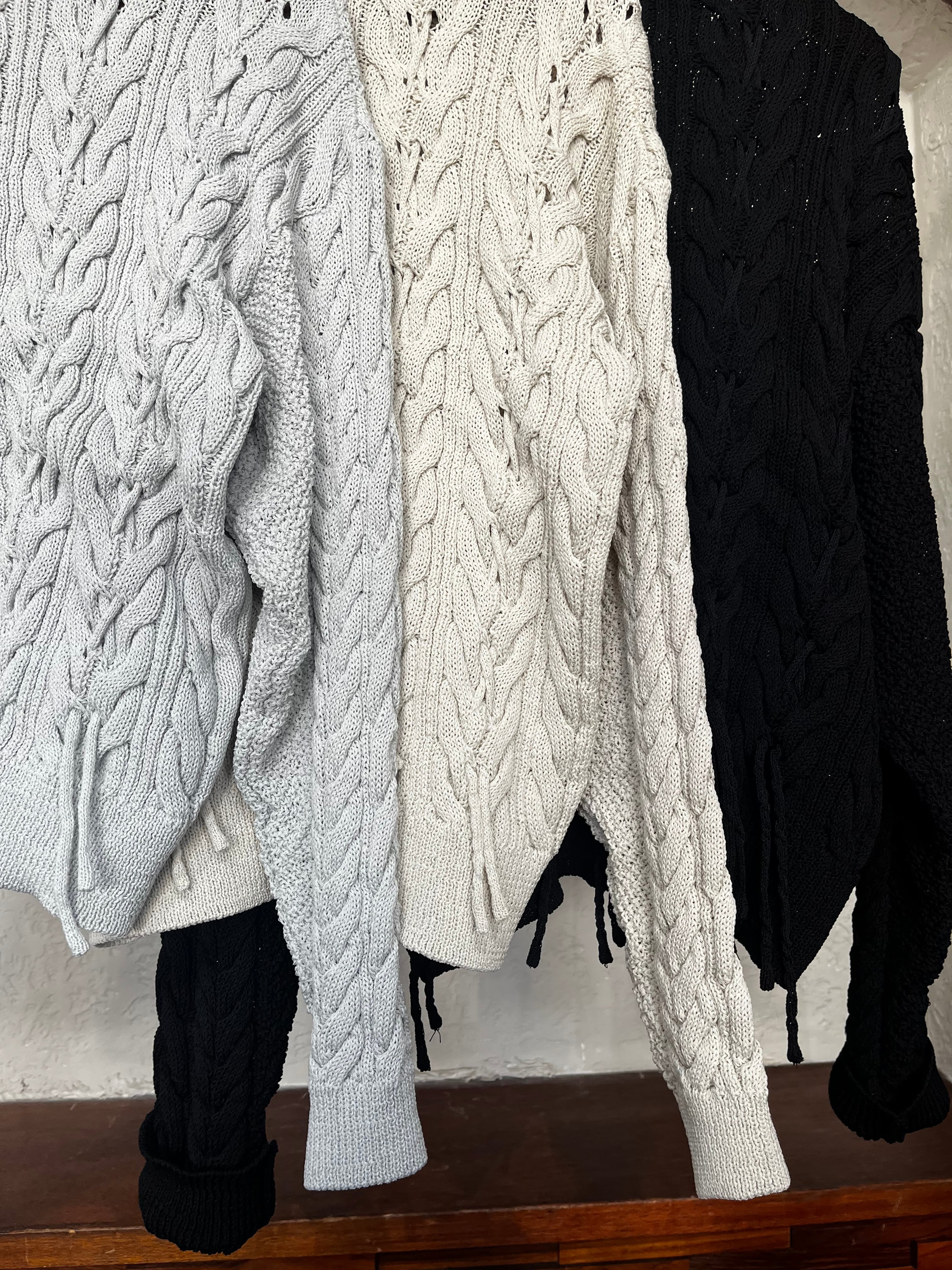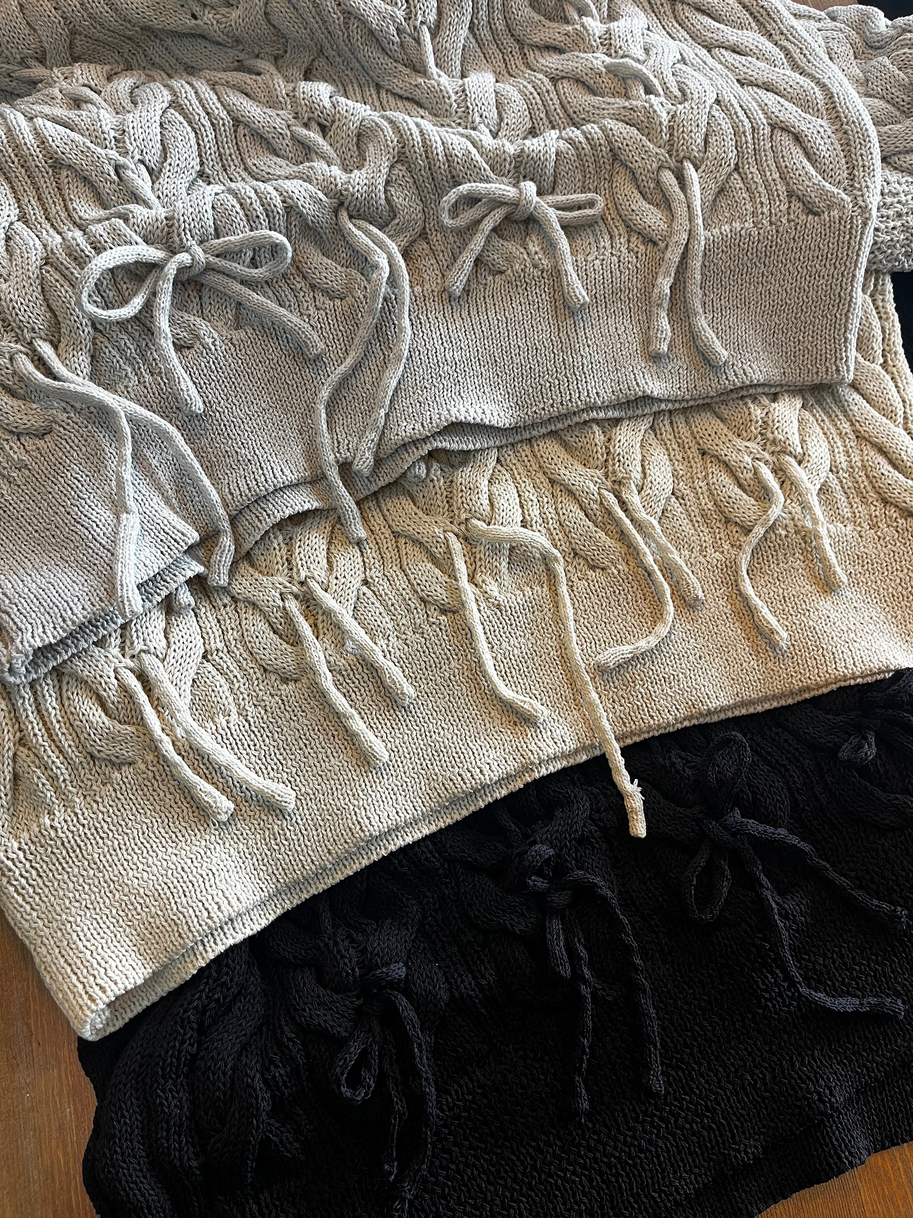 アクリル混糸によるドライで軽快なケーブル編みニット地で、編み目に合わせるように前後身ごろ10本のコードが配され、コードの調節や縛り方のアレンジで様々な表情を楽しめる春ニットになっています。
