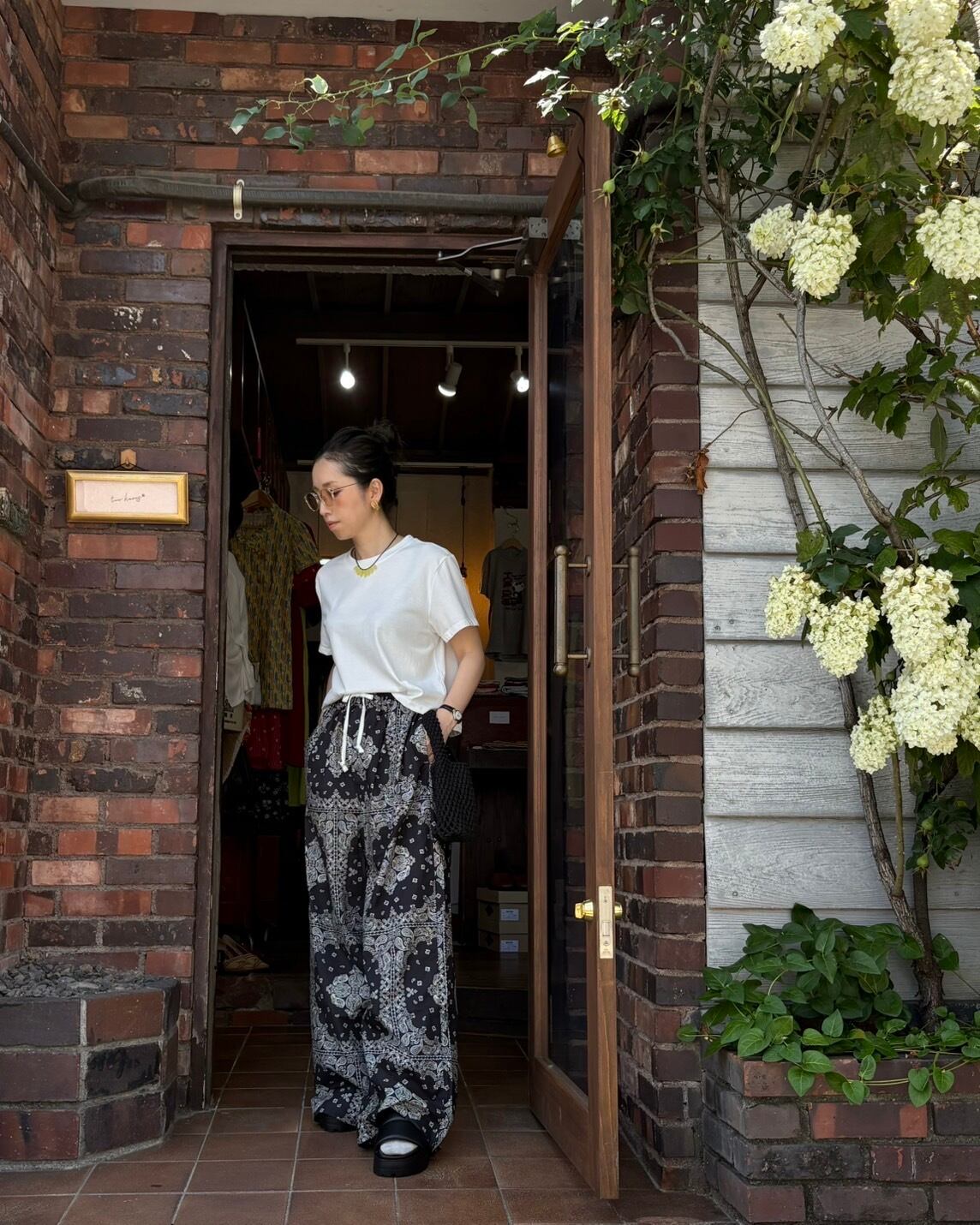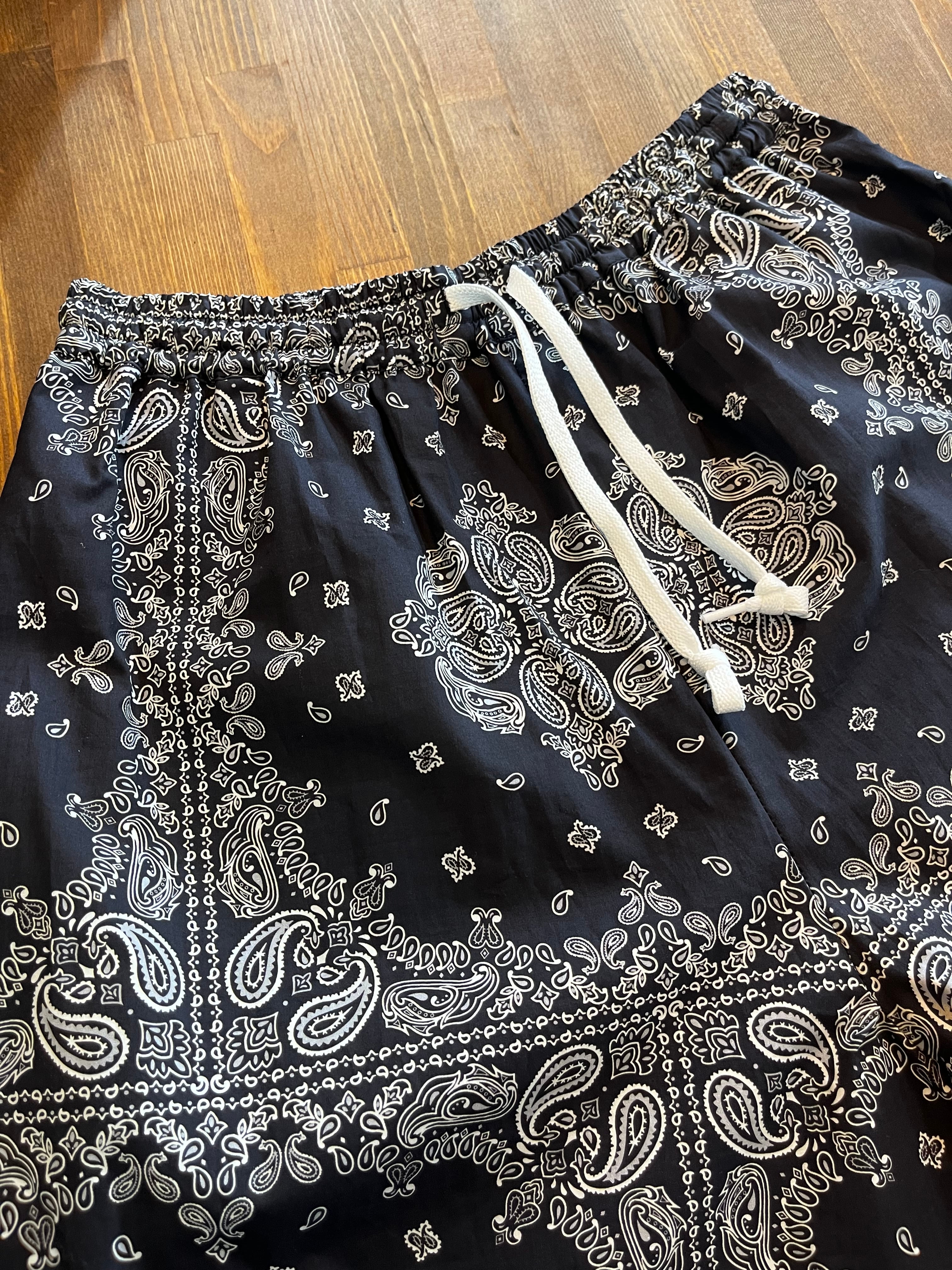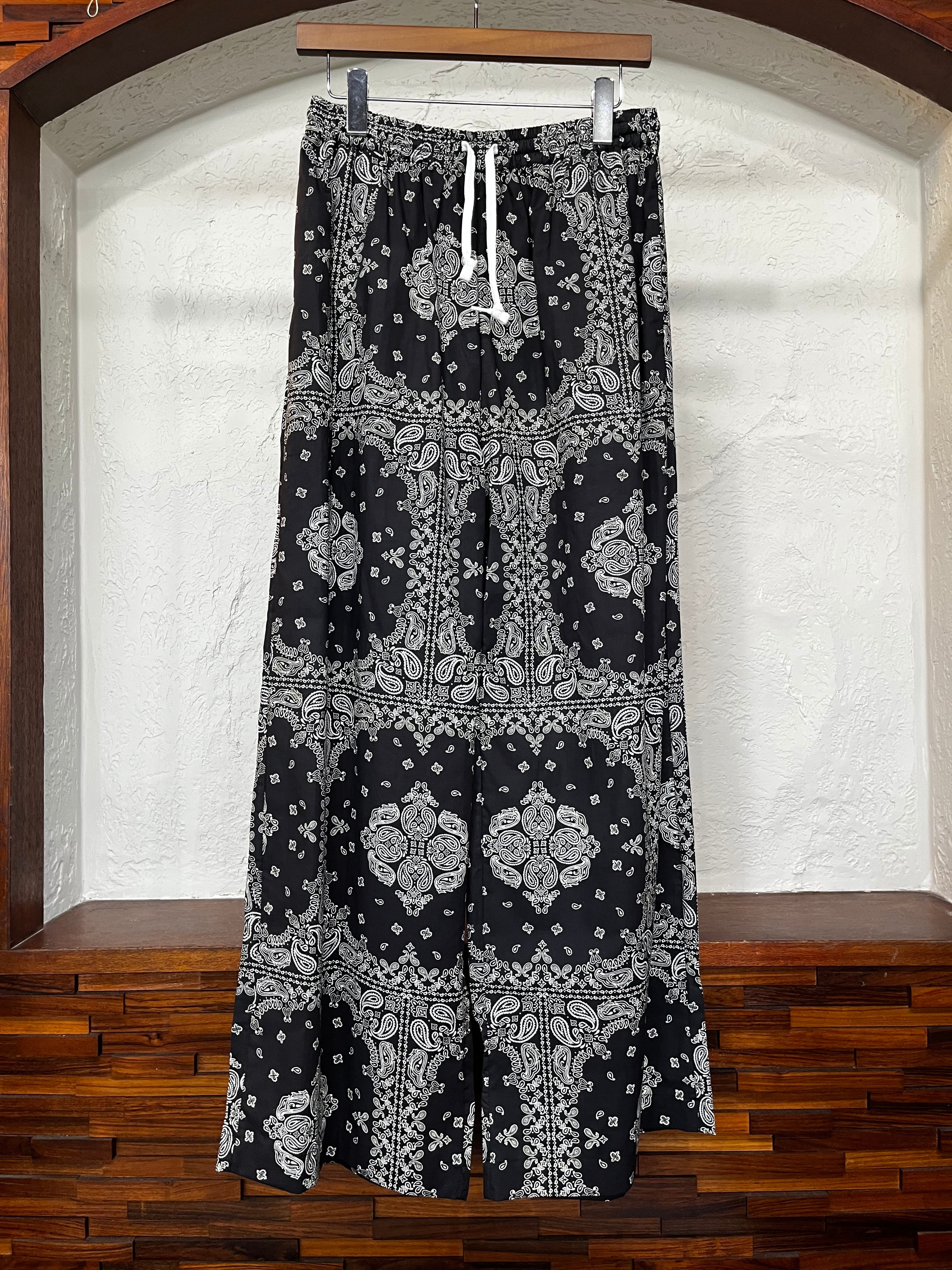 程よいハリ感がありながらも薄手で軽く、モダンな表情のペイズリー柄コットン生地を使い、ウエストはゴム&ドローコードのイージー仕様に、レングスは裾までズドンと太いワイドなシルエットのイージーパンツ。