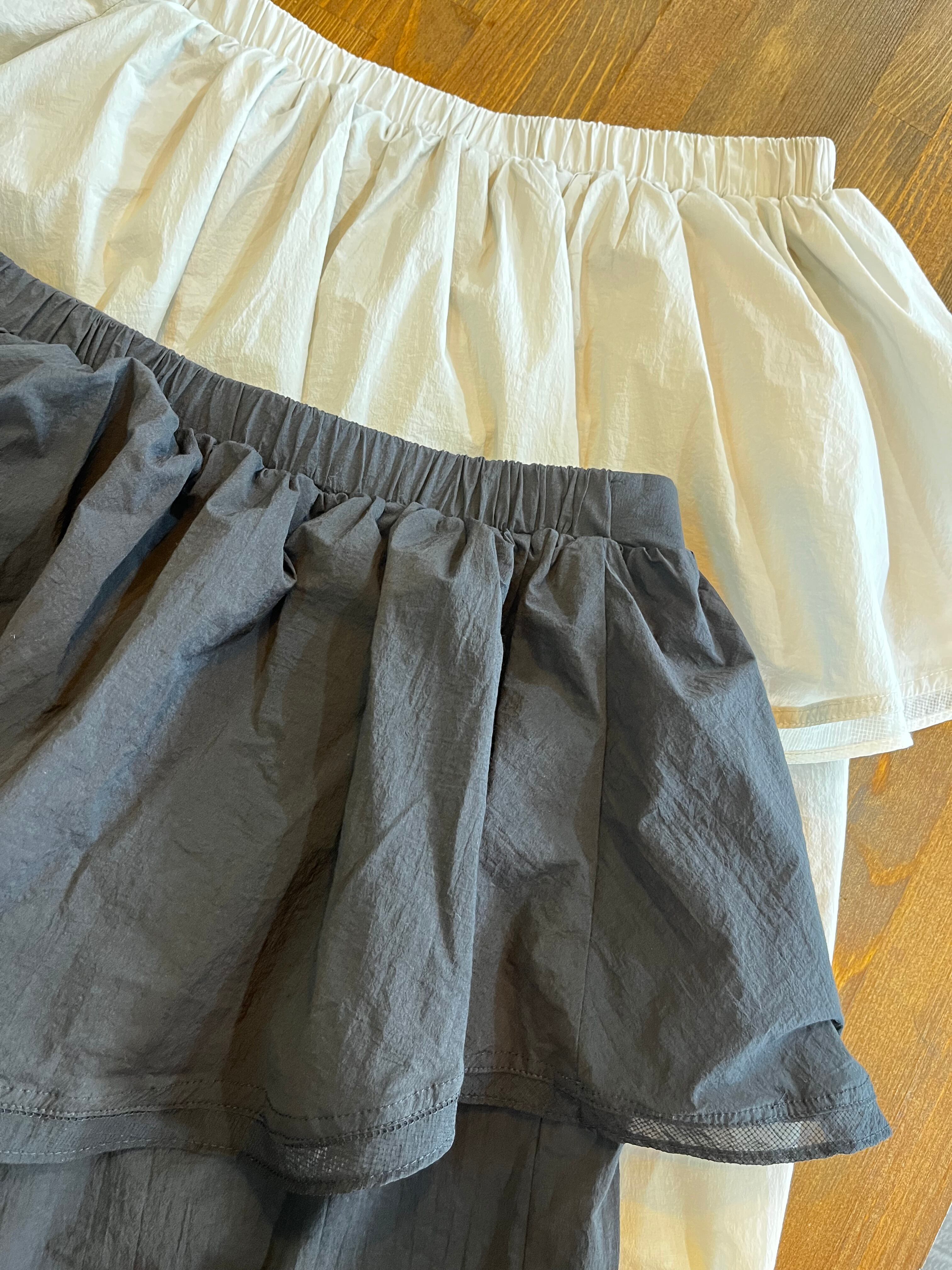 薄手で軽く、さらりとドライな肌触りと程よいハリ感を併せ持つナイロン混生地を使い、縁にレースを利かせたスカートを腰周りに配し、良いワイド感あるレングスは裾にドローコードを付けお好みのシルエットアレンジも楽しめる1本。